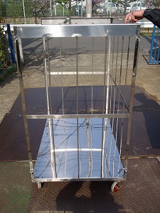 クリーンルームで使用するステンレス製カゴ車です。オールステンレス304仕様。キャスターは熱に強いフェノール車輪を使用しています。押手を側面に設置。各台車を連結して一度に動かせる仕様になっております。有効内寸、有効高、その他さまざまの条件をクリアーして製作いたしました。{ジャパンガス株式会社様}